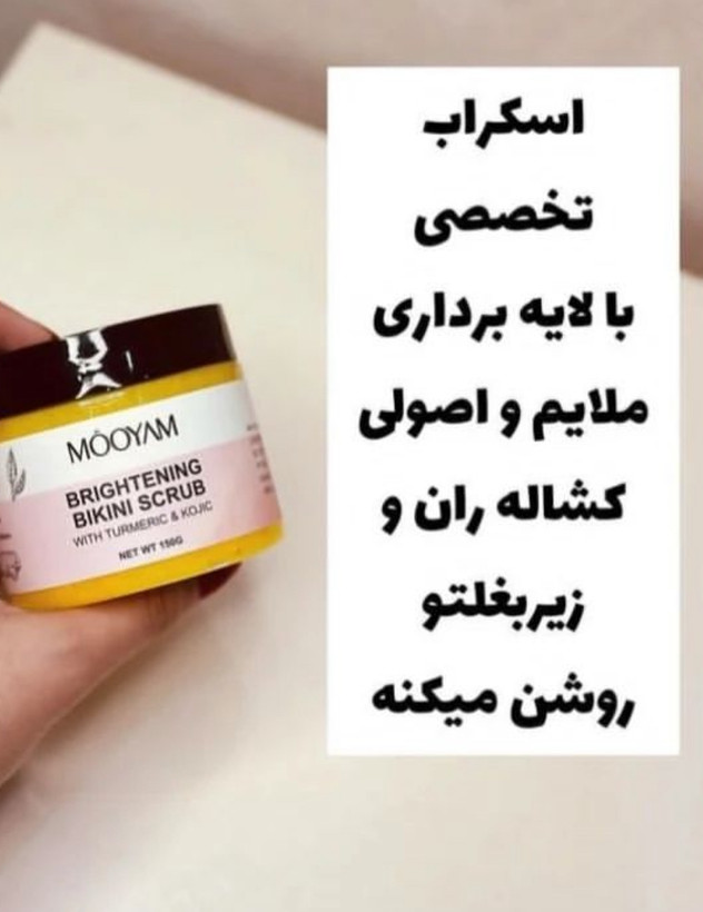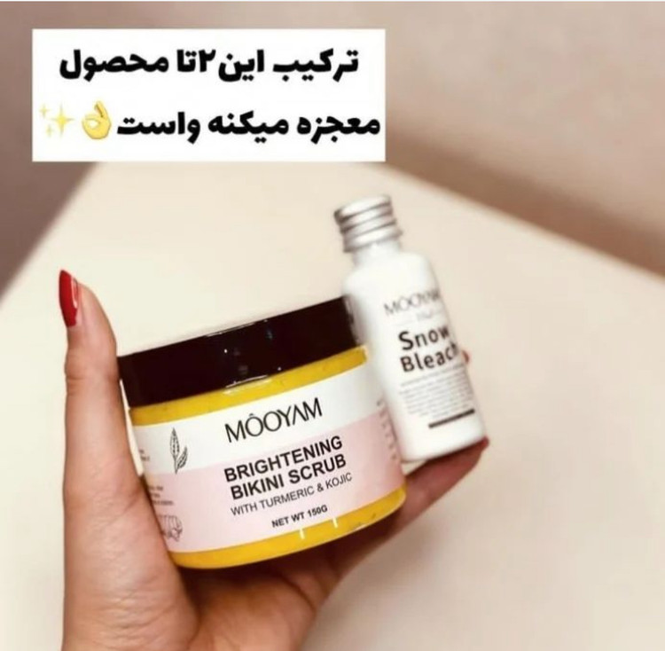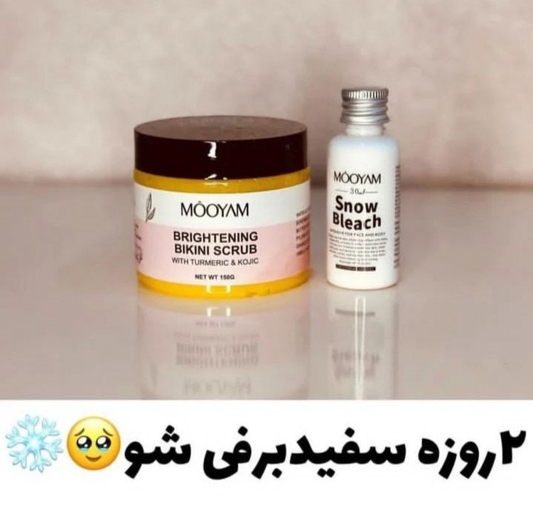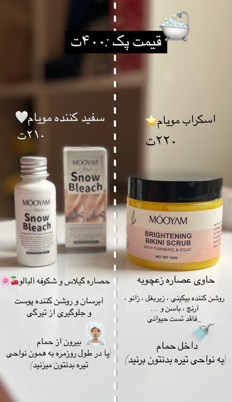 درمان تیرگی یک هفته اگر با هم استفاده کنی خیلی زودتر نتیجه میگیری اسکراب مویام که از عصاره زعچوبه هستش و با دونه هایی که داخلش داره لایه برداری خیلی خوبی انجام میده درمان تیرگی درمان کیست مویی درمان پوست مرغی شدن سفید کننده یا سفید برفی مویام که ابرسانیش خیلی خوبی داره و بعد از حمام به پوست و جاهای تیره بدنتون بزنید ضدلک و حساسیت هستش برای تیرگی های حتی بیکینی اسکراب: سفید کننده :210ت پک دو عددی با تخ.فیف:400ت